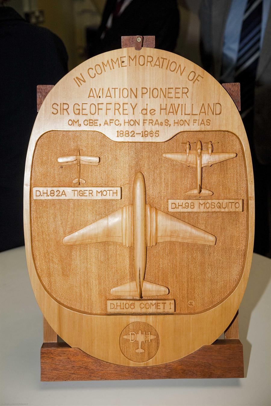 Two commemorative plaques, created by the Hatfield Branch of the Royal Aeronautical Society, were unveiled by Sir Geoffrey de Havilland’s granddaughter, Anne Essex, at the Hatfield College Lane Campus of the University of Hertfordshire on Wednesday 22nd September 2010. One plaque is a metal plate noting just some of the notable de Havilland “firsts”, initiated by Mike Ramsden some time ago. The other is a superb bas-relief carving in lime wood by Stan Kimm. It features the Tiger Moth, Mosquito and Comet airliner, and is seen here at the moment of unveiling. Anne was accompanied by her husband John Essex.